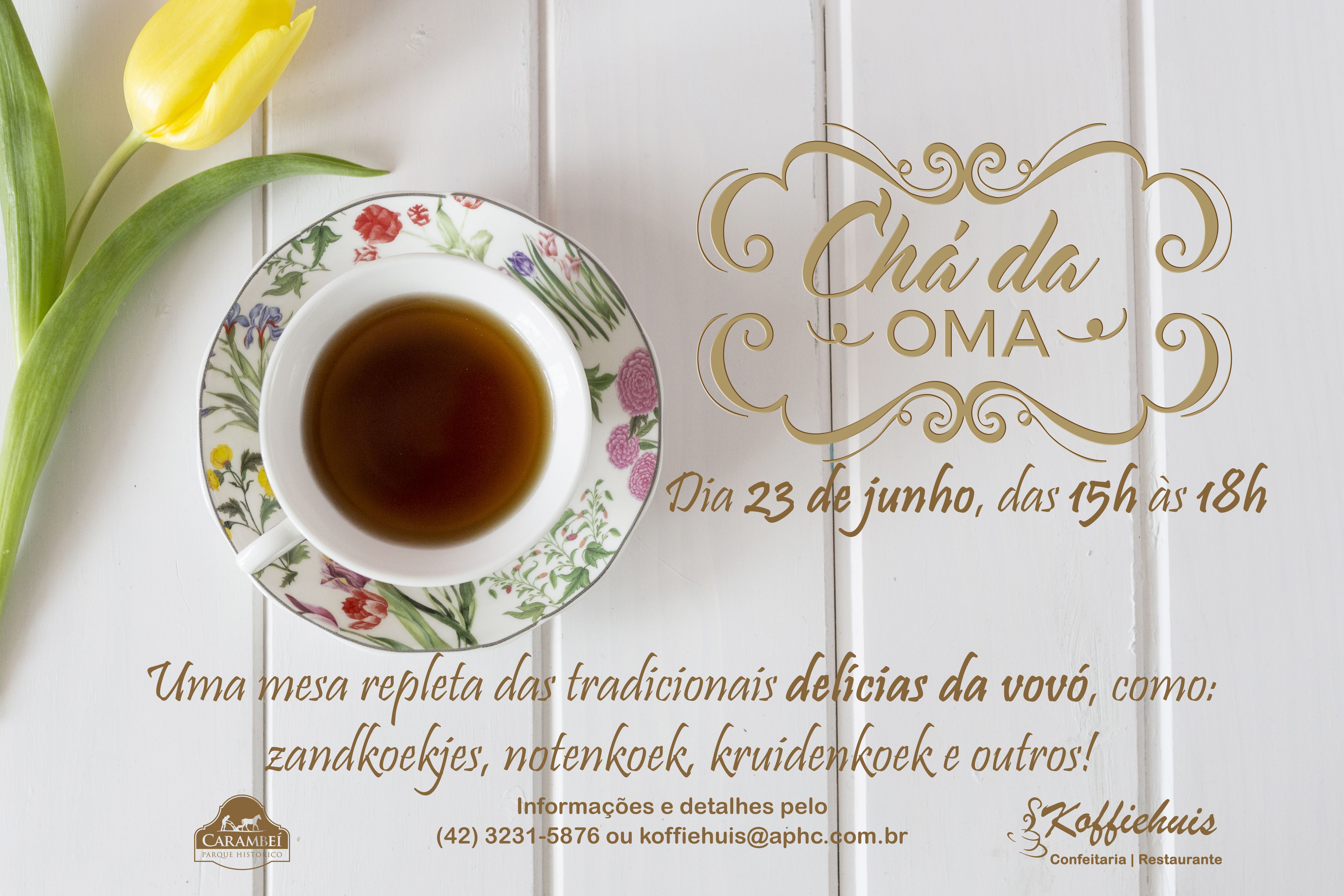 Pensando nos clientes que são apaixonados pelas guloseimas preparadas pela vovó. O Koffiehuis Confeitaria e Restaurante Parque Histórico de Carambeí colocou em seu calendário de atividades o Chá da Oma (Chá da Vovó). A próxima edição do evento foi agendada para o dia 23 de junho, a partir das 15h, mais informações e reservas pelo telefone 42 3231-5876.