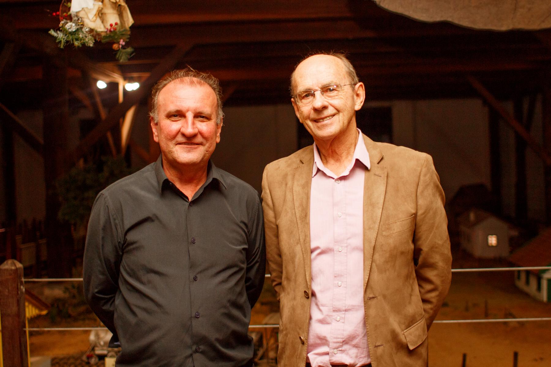 Osmar Blum prefeito municipal de Carambeí e Dick Carlos de Geus presidente do Parque Histórico celebram a chegada do Natal no Parque.