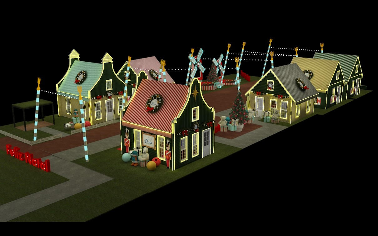 A ornamentação do Parque das Águas, uma das alas museais do Parque Histórico, também ficou por conta da Frísia que está cobrindo os telhados das casinhas e colocando objetos coloridos para tornar o ambiente mágico.