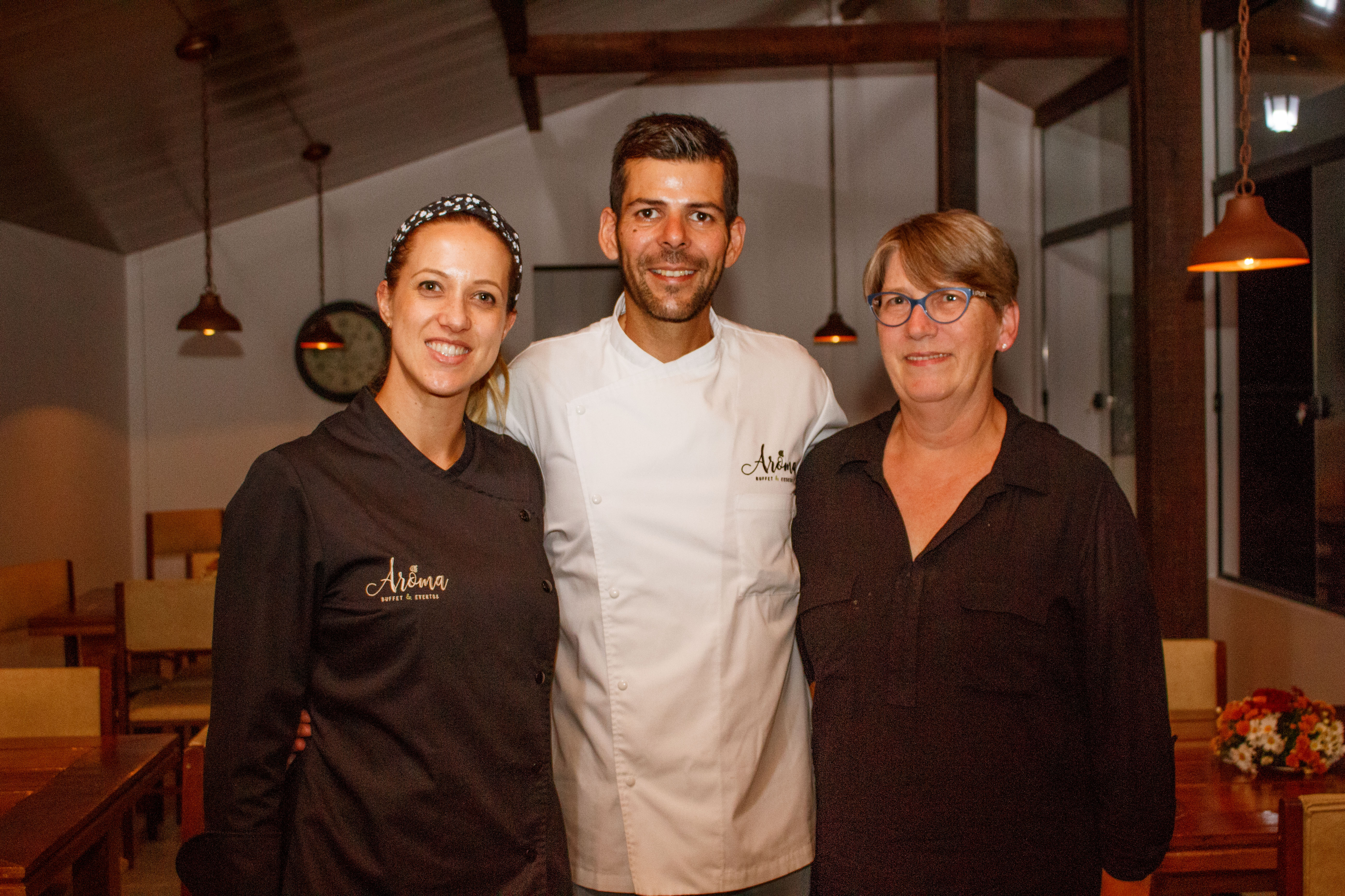 O jantar foi servido com pratos rigorosamente preparados pela equipe do Aroma Buffet e Evento. Na foto, os chefes de cozinha Viviane Prato e Rafael Leão ao lado da gerente do Parque Histórico Froukje J. Bueno