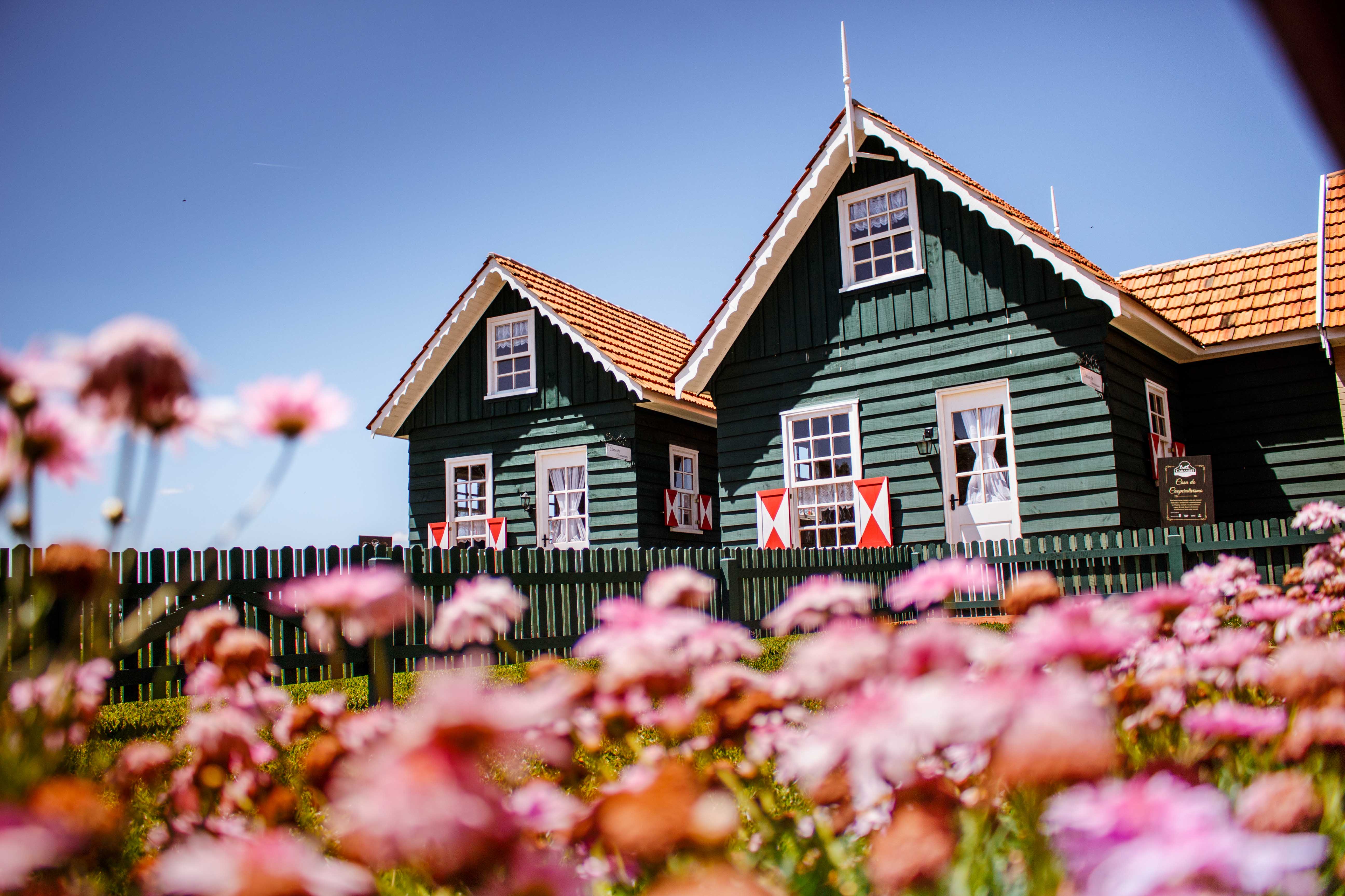 Arquitetura holandesa do Parque das Águas com flores da estação cativam o público