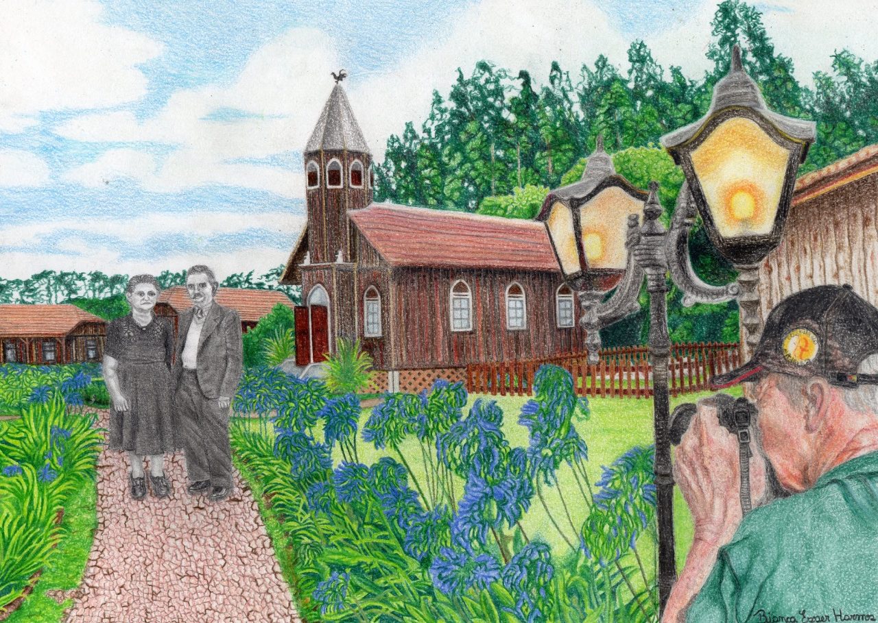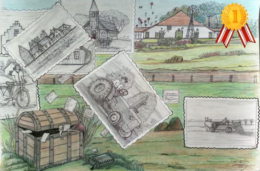 “Usei o que tinha em casa, material simples e barato, grafite, lápis de cor, caneta preta, borracha, uma folha branca e fotos antigas. Representei a obra exatamente como vejo o Parque, um baú velho cheio de lembranças saindo de dentro dele e representando com fotografias as atividades realizadas pelos pioneiros, as quais são vistas no museu através de fotos e objetos. O Parque Histórico é um lugar para recordar e não para deixar esquecido, um lugar de confraternização e alegria demostrado assim com os balões que estão subindo do museu para o céu”, conta Margarida.