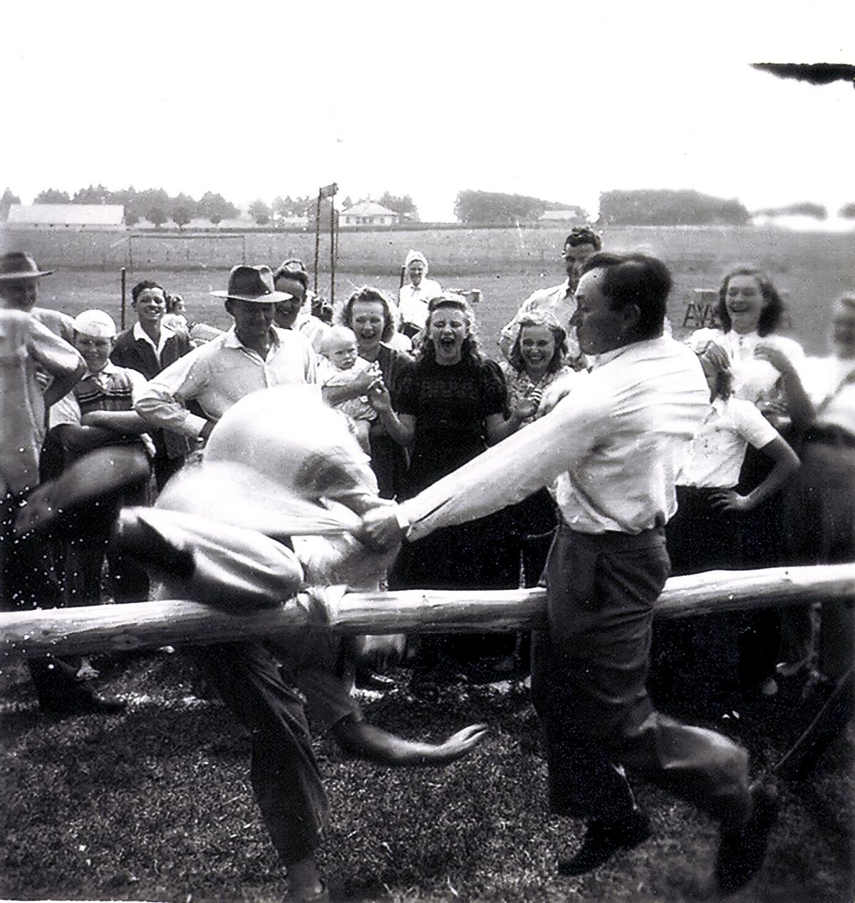 Zakslaan (briga com travesseiros), registro de uma das brincadeiras que marcaram gerações na Colônia Carambeí (Foto: acervo Museu Parque Histórico de Carambeí).