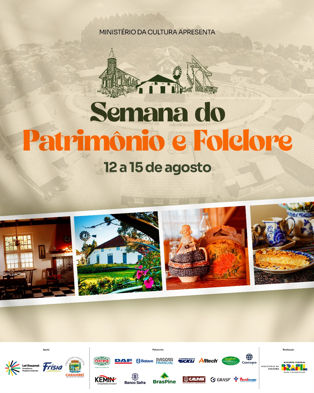 As atividades da Semana do Patrimônio e Folclore do Museu Parque Histórico de Carambeí são gratuitas e voltadas para estudantes do Ensino Fundamental I ao Ensino Médio, sendo realizadas apenas com agendamento prévio. Para mais informações e agendar grupos, entre em contato pelo whatsapp 42 9101-6674.