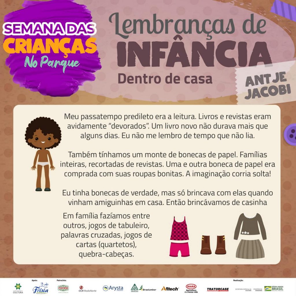 Entre tantas recordações ela conta que andava de patins com uma corda amarrada na bicicleta e alguém puxava, pulava elástico, se divertia empilhando um monte de potinhos de plástico e depois a graça era chutar, brincava de pega vareta e playmobil, também brincava de bonequinha de papel que dava para trocar roupas de papel.