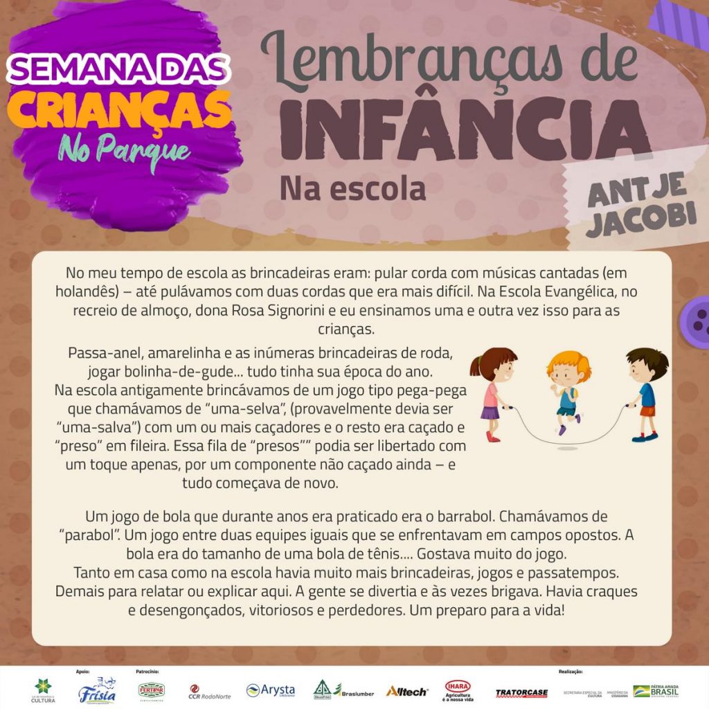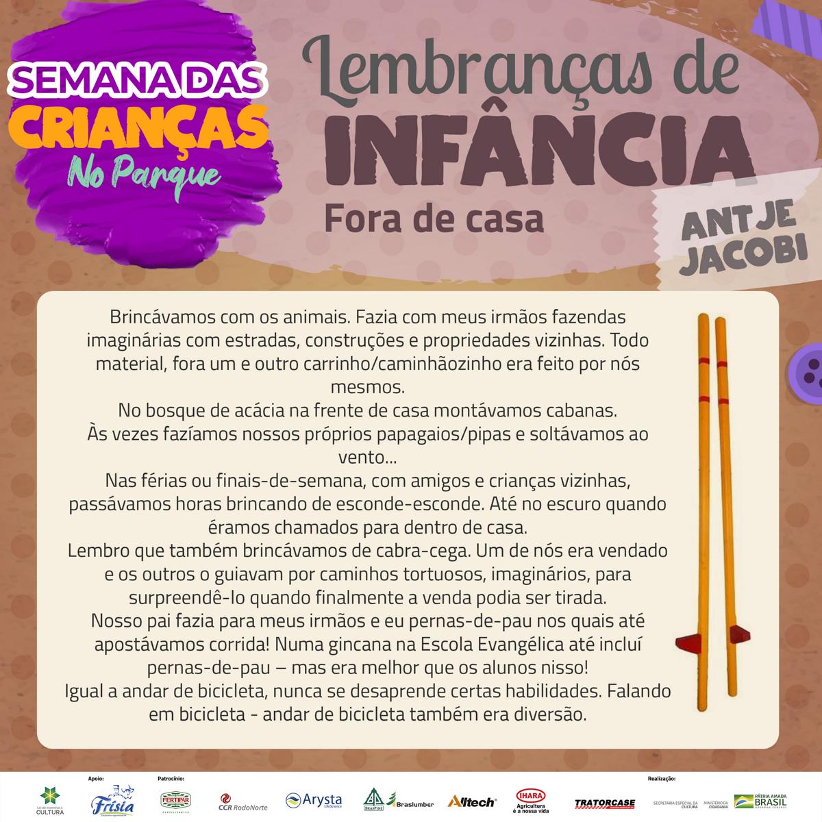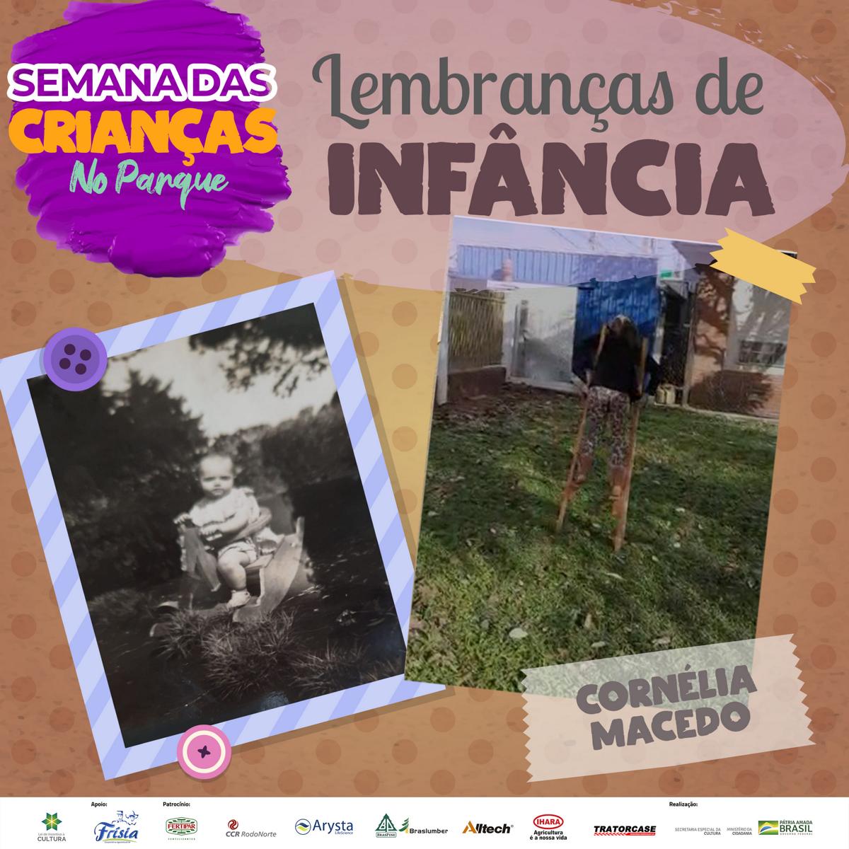 Cornélia Macedo relata que em sua infância as brincadeiras eram sempre fora de casa, a não ser que chovesse. Ela brincava com seus primos da vizinhança, fazíam casinha, barracas que até hoje faz com sua neta. Brincava com a boneca que ganhou aos nove anos e ainda guarda, a boneca tão tinha nome e a sua neta mais velha quando brincou com ela a chamava de Gabi. Andava de perna de pau, no mês passado estava ensinando a brincadeira a sua netinha mais nova. Pulava corda, brincava de esconde-esconde, já fez essas brincadeiras com seus netos. No tempo da sua infância, as crianças, andavam livres por aí: pelos campos, fazendo piquenique, no verão nadava no lageado com suas primas, pescando lambaris e andando a cavalo. Estudava pela manhã e tinha as tardes livres para brincar. Jogava bolinha de gude com meu irmão, sempre brincava com outras crianças.