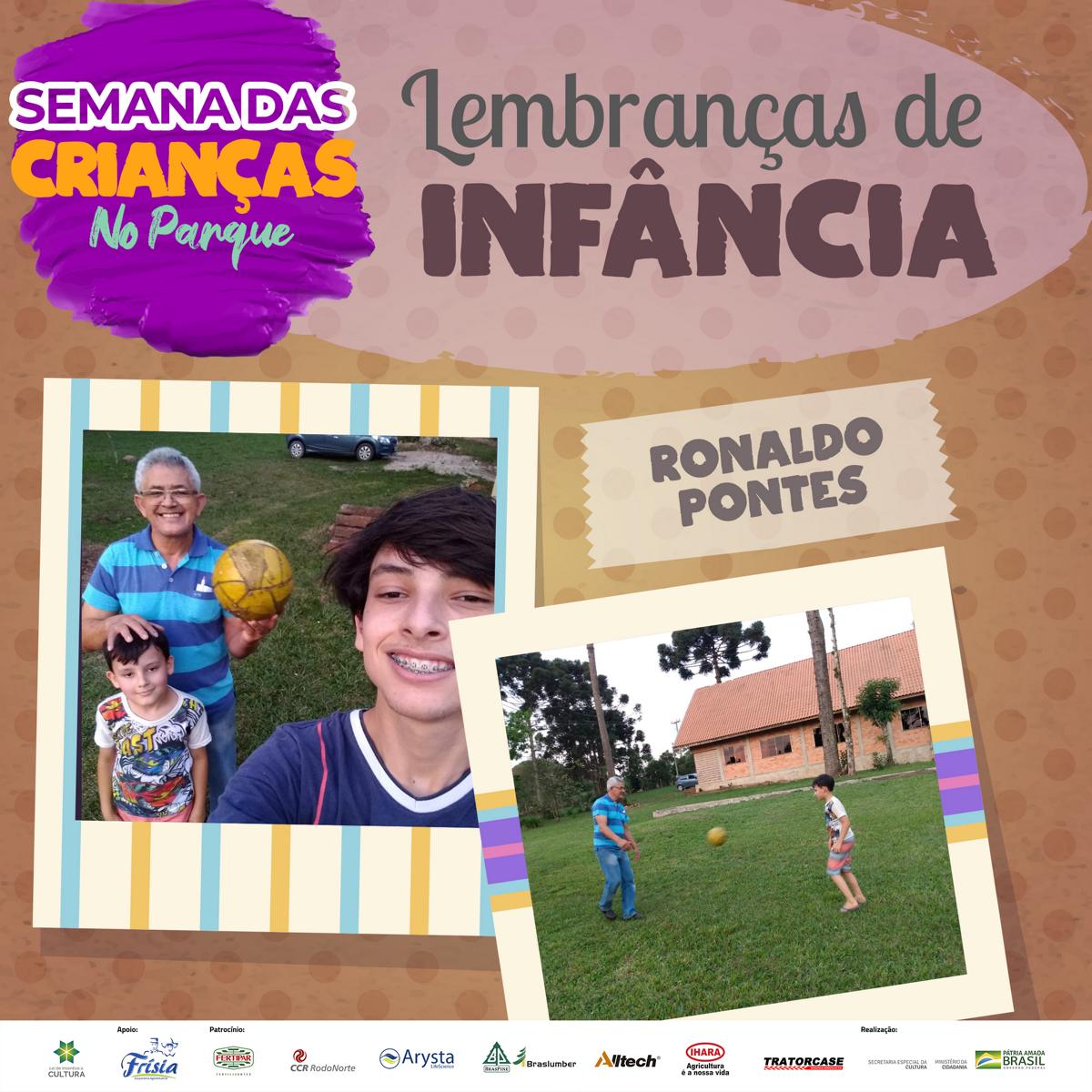 Ronaldo Pontes trabalhava muito mais do que brincava, mas quando brincava era de nadar no lageado, pé na lata, circo no campinho que fazia com madeiras e barbante. A brincadeira que ele mais gostava e a preferida até hoje é a bola que ele brincou com os filhos na rua de casa e agora, além de brincar com eles, brinca também com os netos.